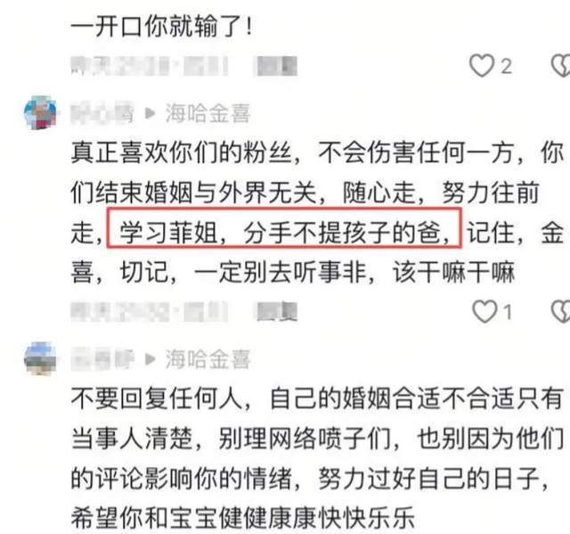 也有网友鼓励海哈金喜,不要回复任何人,学习菲姐,分手不提孩子的爸爸。话又说回,王菲与李亚鹏离婚后,也没有网友在她的评论区留言攻击与嘲讽啊!